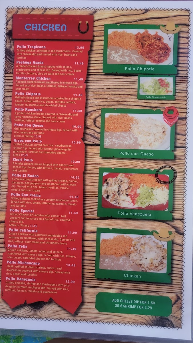 T-bone steak topped with grilled shrimp, onions, bell peppers, tomatoes, smothered in cheese dip. Served with rice, beans and tortillas.
